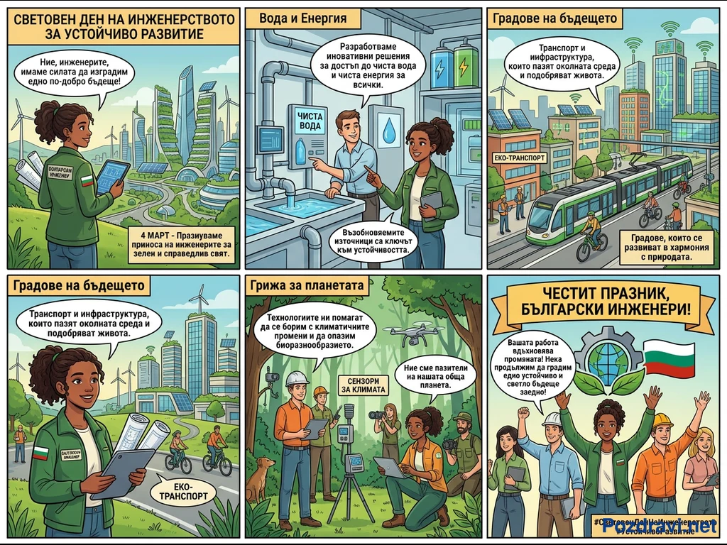 Този комикс от шест панела илюстрира ролята на инженерите в изграждането на устойчиво бъдеще. Той показва как инженерите допринасят за зелени градове с еко-транспорт, достъп до чиста вода и енергия, и опазване на околната среда чрез модерни технологии. Различни сцени представят иновации в енергетиката, градското планиране и мониторинга на климата. Комиксът подчертава значението на възобновяемите източници и хармонията с природата. Завършва с послание за Световния ден на инженерството и поздрав към българските инженери за техния принос.