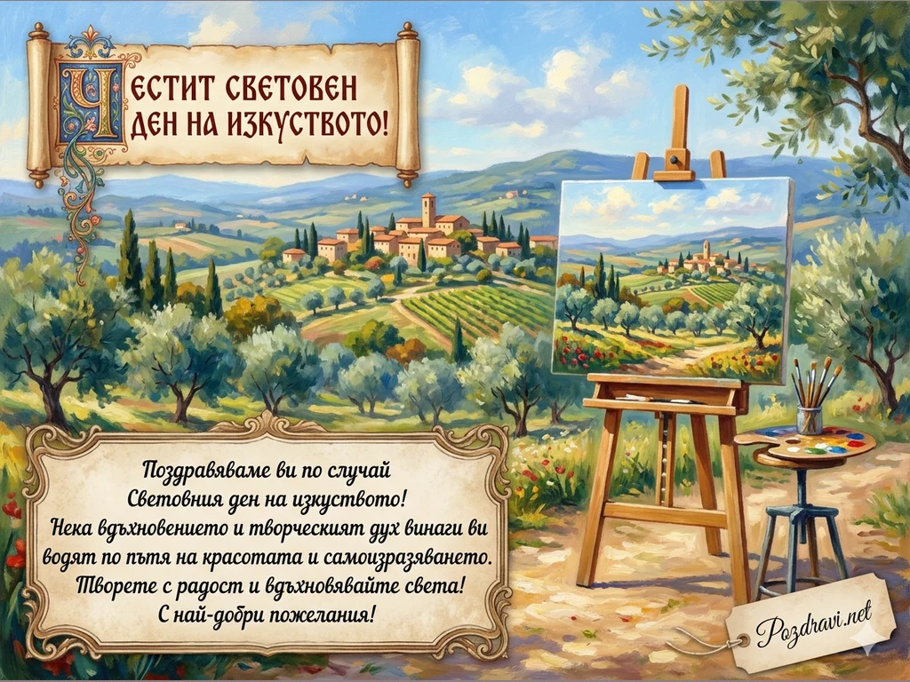 > 'Поздравяваме ви по случай Световния ден на изкуството! Нека вдъхновението и творческият дух винаги ви водят по пътя на красотата и самоизразяването. Творете с радост и вдъхновявайте света! С най-добри пожелания!'