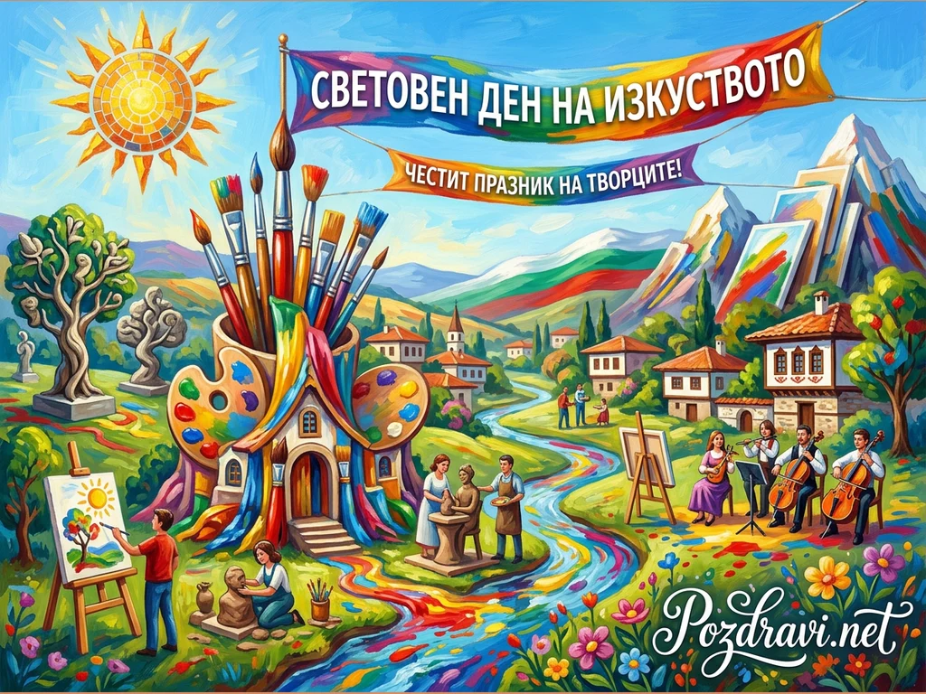 Ключови фрази: Световен ден на изкуството, Поздрави за творци, Празник на изкуството, Цветна илюстрация, Картичка за художници