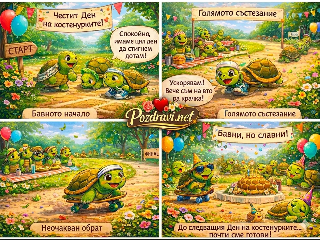 В цветен комикс от четири сцени весели костенурки празнуват своя ден в слънчев парк с балони и цветя.