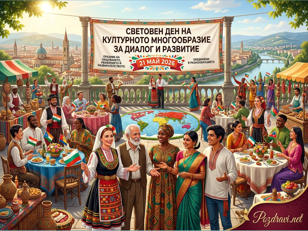 Картината изобразява оживен празник на културното многообразие, където хора от различни етноси, облечени в традиционни носии, са събрани на тераса с изглед към живописен европейски град. Множество участници държат знамена на различни държави, включително български и индийски, докато други са седнали на маси, наслаждавайки се на храна и напитки. В преден план усмихната група от хора в народни облекла, сред които българка, възрастен мъж и представители на индийската и африканската култура, общуват приятелски. На заден план голям транспарант обявява 'СВЕТОВЕН ДЕН НА КУЛТУРНОТО МНОГООБРАЗИЕ ЗА ДИАЛОГ И РАЗВИТИЕ' и датата 21 май 2026 г., а на пода е изобразен цветен глобус. Цялостната атмосфера е празнична и приканваща, символизираща единството в разнообразието.