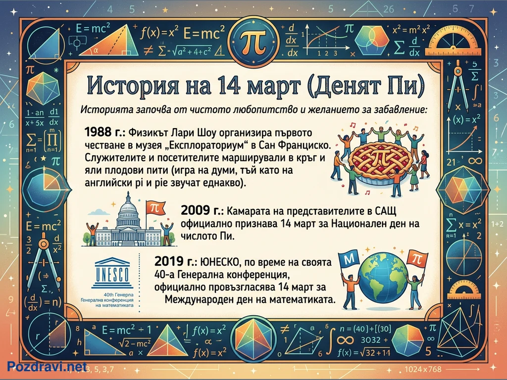 Тази инфографика проследява историята на 14 март, известен като Деня Пи и Международен ден на математиката. Централният текст описва ключови моменти като първото честване през 1988 г. от Лари Шоу, официалното признаване от Камарата на представителите на САЩ през 2009 г. и обявяването от ЮНЕСКО през 2019 г. за Международен ден на математиката. Около текста са разположени множество математически формули, графики и геометрични фигури, свързани с числото Пи и различни математически концепции. Илюстрациите включват хора, празнуващи с пай, сградата на Капитолия и глобус с флагове, символизиращи празника. Цялостният дизайн е образователен и визуално ангажиращ, съчетаващ исторически факти с математически елементи.