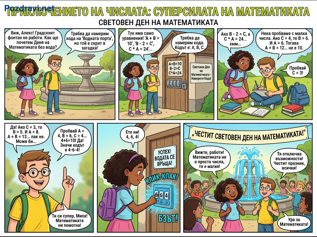 Ключови фрази: Математически комикс, Световен ден на математиката, Образователна игра, Решаване на задачи, Детски приключения