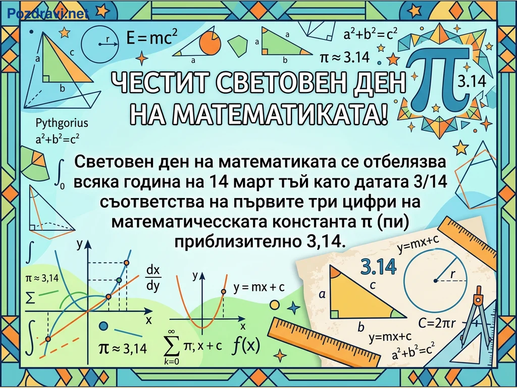Тази цветна илюстрация е посветена на Световния ден на математиката, отбелязван на 14 март, свързан с приблизителната стойност на числото Пи (3,14). Плакатът е богато украсен с разнообразни математически символи, формули и геометрични фигури. Виждат се Питагорова теорема, уравнението E=mc², графики на функции, интеграли, суми, както и измервателни инструменти като пергел и линийка. Дизайнът е образователен и привличащ вниманието, с декоративна рамка, подчертаваща темата за числата и геометрията.