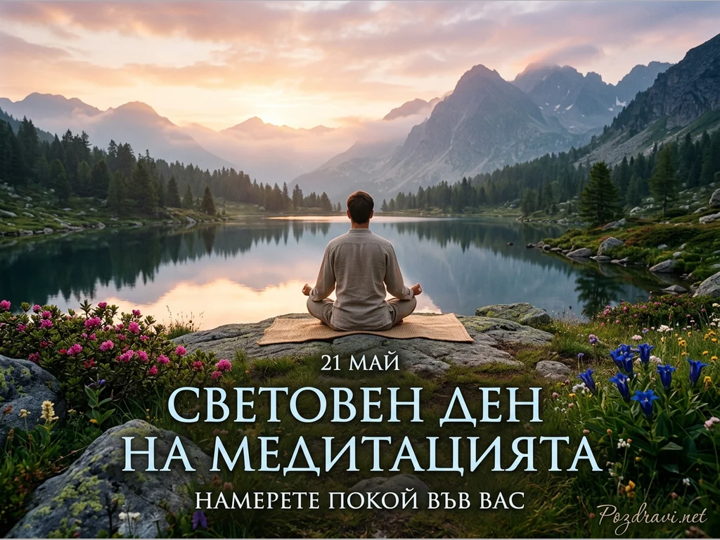 Мъж медитира в поза лотос на брега на спокойно планинско езеро, облечен в светли дрехи и седнал върху рогозка. Зад него се издигат величествени планини и гъсти гори, а небето е озарено от меките цветове на изгрев или залез, отразяващи се във водната повърхност. Около него цъфтят розови и сини планински цветя, добавяйки красота към идиличната сцена. Картичката отбелязва '21 МАЙ СВЕТОВЕН ДЕН НА МЕДИТАЦИЯТА' с посланието 'НАМЕРЕТЕ ПОКОЙ ВЪВ ВАС'.