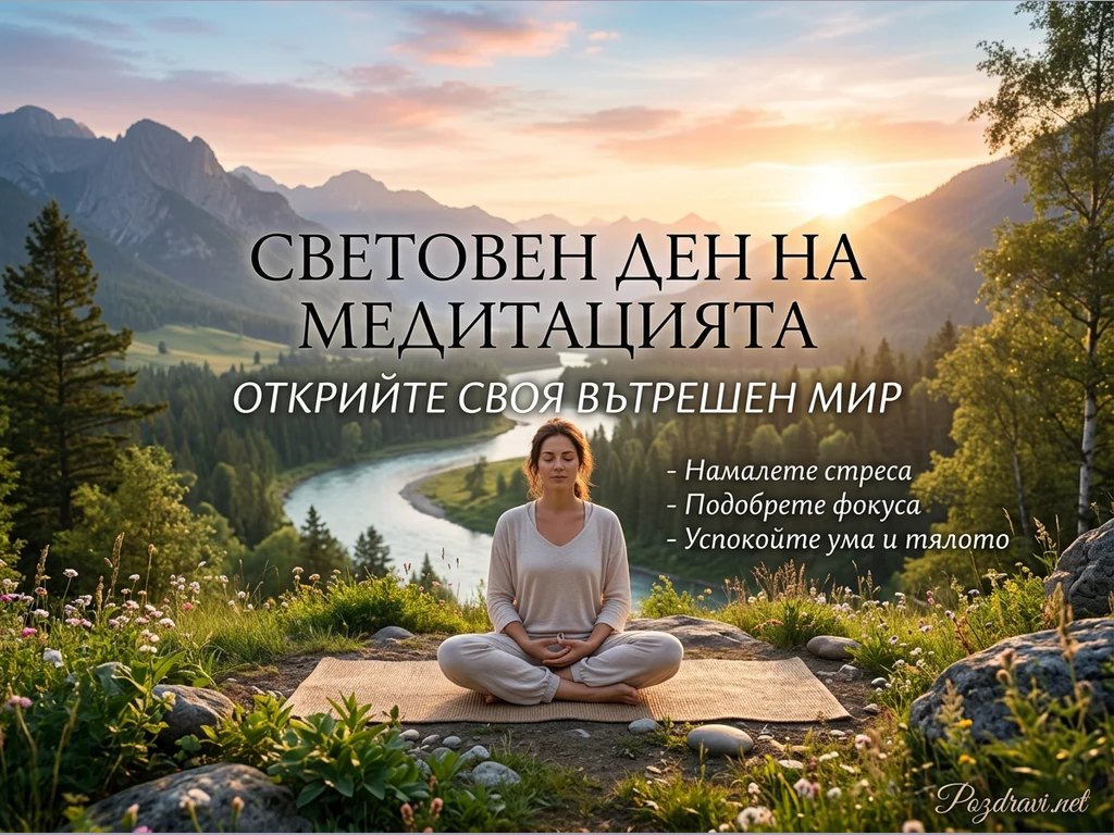 Жена медитира в поза лотос на постелка сред живописна природа. Тя е разположена на хълм с изглед към извиваща се река, гъсти гори и величествени планини на заден план. Небето е озарено от топлите цветове на изгрев или залез, създавайки спокойна и вдъхновяваща атмосфера. Надписът 'СВЕТОВЕН ДЕН НА МЕДИТАЦИЯТА' и призиви като 'ОТКРИЙТЕ СВОЯ ВЪТРЕШЕН МИР' подчертават темата за вътрешния покой и ползите от медитацията.