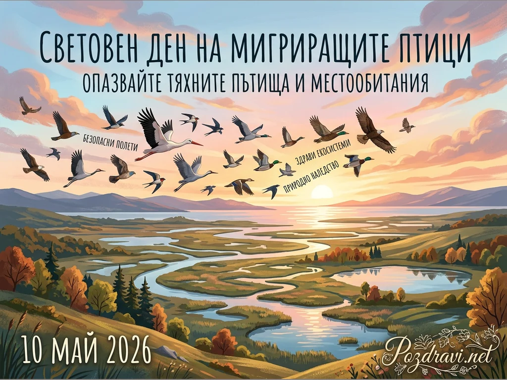 Картината показва живописен пейзаж по залез или изгрев слънце, изпълнен с мигриращи птици. Разнообразно ято от щъркели, патици, лястовици и хищни птици прелита над обширна речна система с множество езера и влажни зони. Околните хълмове са покрити с дървета в есенни багри, а небето е оцветено в топли нюанси на оранжево и розово. В горната част е изписано 'СВЕТОВЕН ДЕН НА МИГРИРАЩИТЕ ПТИЦИ ОПАЗВАЙТЕ ТЯХНИТЕ ПЪТИЩА И МЕСТООБИТАНИЯ', а в долния ляв ъгъл е датата '10 МАЙ 2026'. Посланието е за опазване на природата и мигриращите видове.