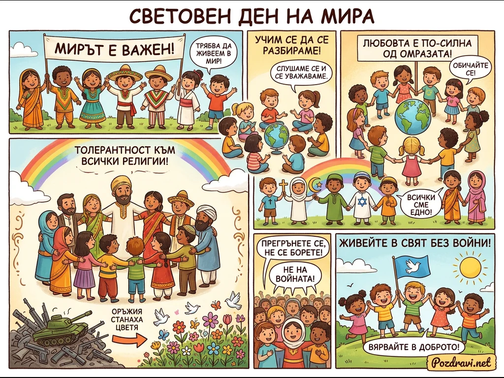 Тази цветна илюстрация, озаглавена 'Световен ден на мира', представя различни сцени, насърчаващи единството и толерантността. Деца от различни култури и религии са изобразени да се държат за ръце, да учат заедно и да се прегръщат, предавайки послания като 'Мирът е важен!' и 'Любовта е по-силна от омразата!'. Картината подчертава важността на взаимното уважение, превръщането на оръжията в цветя и призива за свят без войни, където всички вярват в доброто. Тя е силно послание за хармония и разбирателство между хората по света.