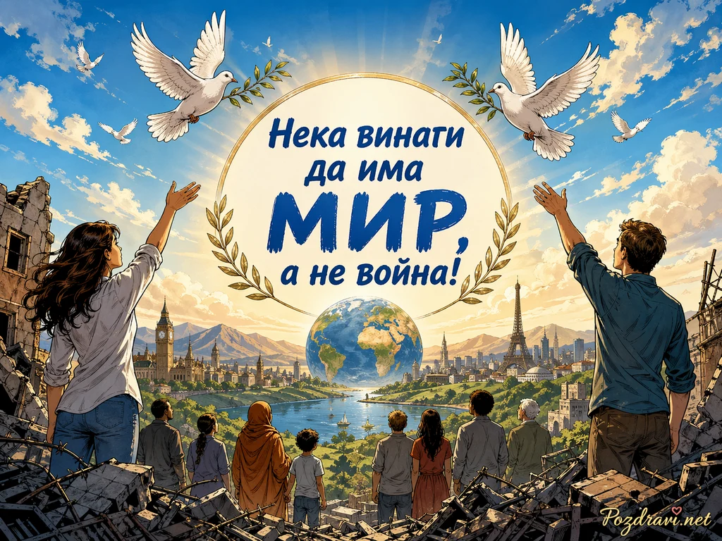 Широко синьо небе с меки облаци озарява сцена, в която светлината се събира около голям кръгъл надпис в центъра. Два бели гълъба с маслинови клонки летят симетрично от двете страни и подсилват усещането за мир и надежда. В предния план мъж и жена са вдигнали ръце към небето, а около тях се виждат руини и разрушени сгради, които напомнят за последиците от войната. По-ниско в композицията група хора, сред които има възрастни и деца, гледа към зелен пейзаж, река и далечни градове. В централната долна част е поставено земното кълбо, което свързва посланието с целия свят и подчертава универсалното желание за мир. На хоризонта се разпознават известни архитектурни силуети и планини, които създават усещане за общочовешко единство отвъд граници и разрушения. Цветовете са ярки и топли, а контрастът между отломките отпред и светлия простор в далечината засилва внушението за избор на мир вместо война.