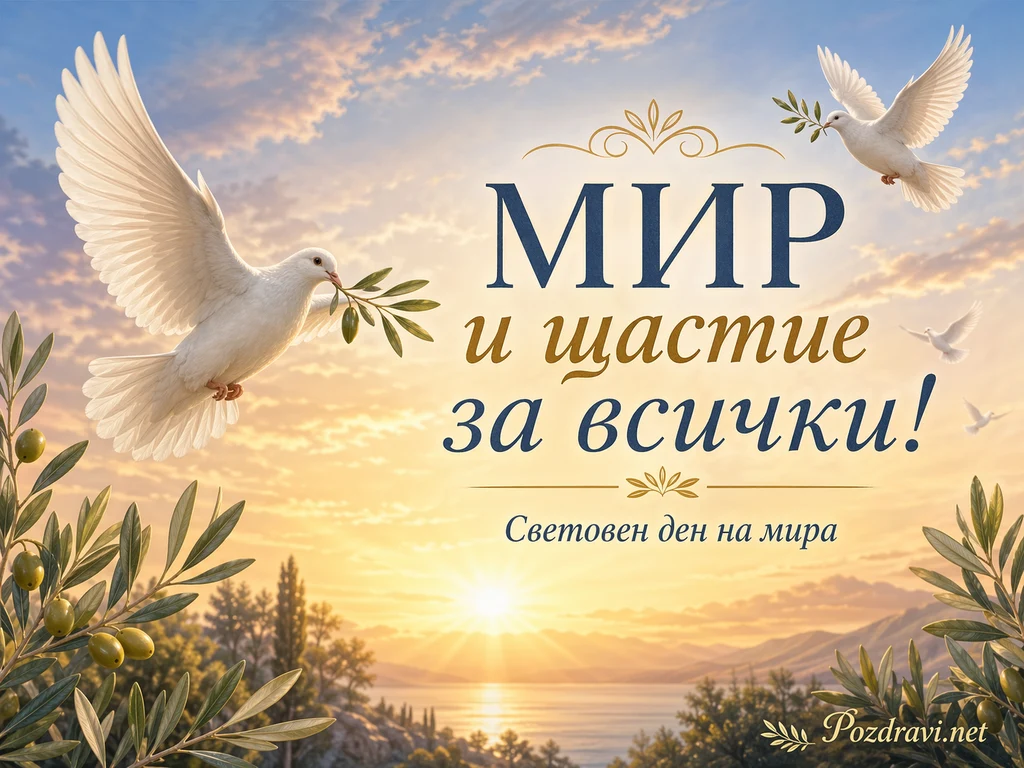 Небето е озарено от мек изгрев с топли златисти и нежносини тонове, които създават усещане за светлина, надежда и спокойствие. В лявата част лети голям бял гълъб с разперени крила, който носи маслинова клонка в човката си като силен символ на мира. В горния десен ъгъл се вижда втори бял гълъб, също с маслинова клонка, а в далечината прелитат още няколко по-малки птици. В центъра е изписано послание за мир и щастие за всички, оформено с елегантни сини и златисти букви. Декоративни орнаменти допълват текста и му придават тържествен и празничен вид. В долната част се разкрива спокоен пейзаж с море, планини и дървета, осветени от слънчевите лъчи. Маслинови клонки с плодове рамкират сцената отстрани и подсилват внушението за хармония, благослов и световен мир.