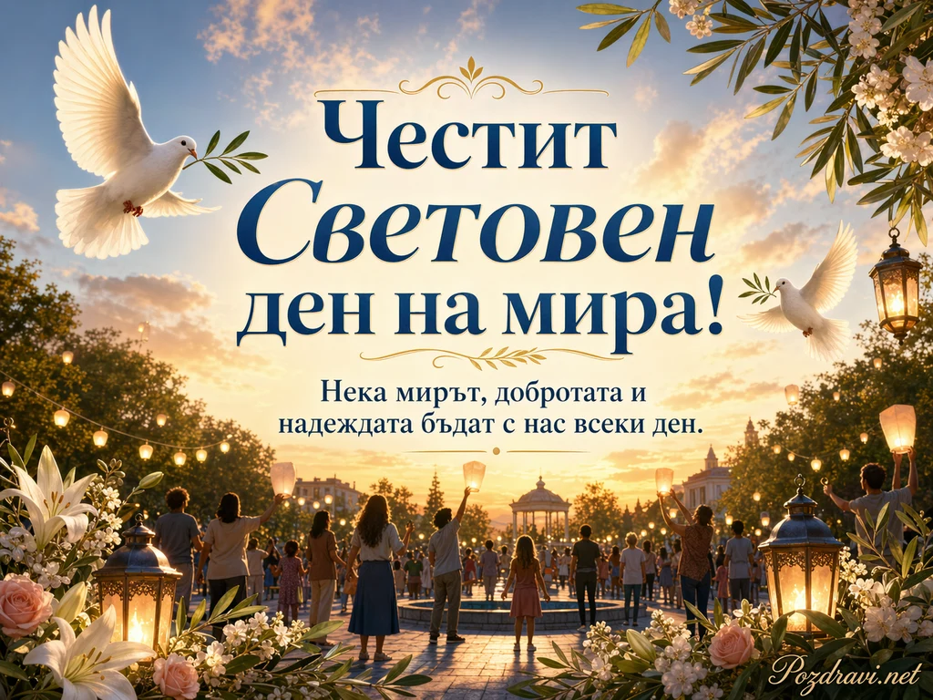 В центъра на сцената стои голям син надпис за Световния ден на мира, поставен върху сияен залез с меки златисти облаци. Отляво и отдясно летят бели гълъби с маслинови клонки, които подсилват символиката на мир, надежда и доброта. В долната част се виждат хора, събрани на широка алея, като част от тях държат светещи фенери и са обърнати към светлината в далечината. Пространството е обрамчено с богати цветя, зелени листа и декоративни фенери, които създават топла и празнична атмосфера. В далечината се откроява елегантен павилион, а цялата композиция води погледа към него по осветената пътека. Горните ъгли са украсени с цъфтящи клони и фина орнаментика, които придават нежност и завършен вид. Общото внушение е за хармония, общност и светла надежда за по-мирен свят.