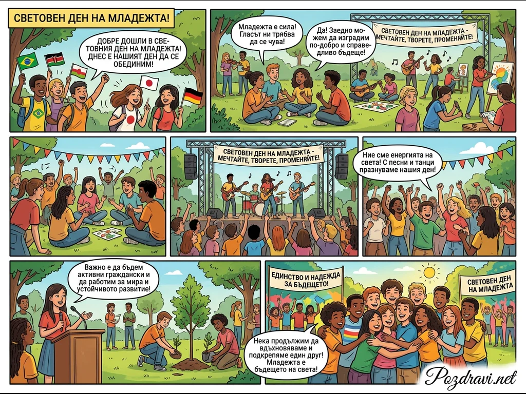 Този цветен комикс илюстрира празника на Световния ден на младежта, показвайки разнообразни млади хора, ангажирани в различни дейности. Панелите изобразяват младежи, обединяващи се с флагове, обсъждащи идеи, творящи изкуство и музика, и участващи в концерт. Допълнителни сцени показват как младите хора застъпват за мир и устойчиво развитие, засаждат дървета и се прегръщат в дух на единство и надежда. Основното послание подчертава силата на младежта да мечтае, твори, променя и изгражда по-справедлив свят.