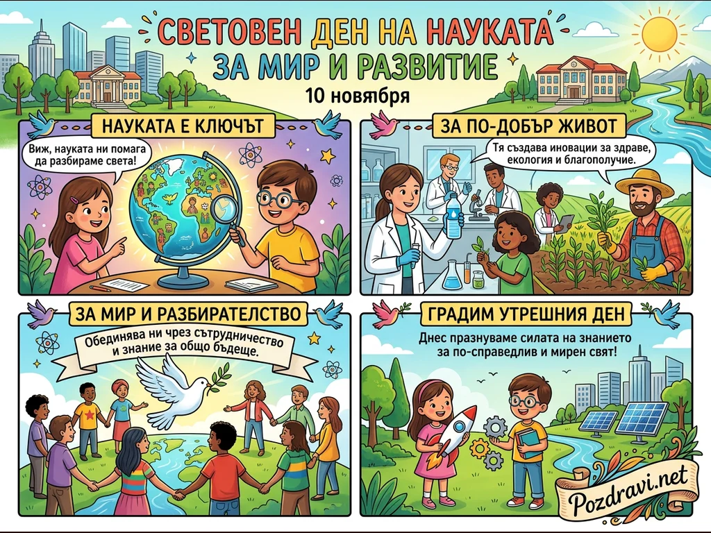 Тази цветна карикатурна илюстрация отбелязва Световния ден на науката за мир и развитие, който се празнува на 10 ноември. Тя е разделена на четири панела, всеки от които показва как науката допринася за разбирането на света, по-добър живот, мир и изграждане на бъдещето. Деца, учени и фермери са изобразени в различни дейности, свързани с научни изследвания, иновации и грижа за околната среда. Акцентът е върху силата на знанието и сътрудничеството за създаване на по-справедлив и мирен свят.