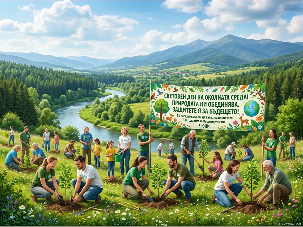 Множество хора от различни възрасти са събрани в живописна долина, за да засаждат дръвчета. На заден план се виждат извиваща се река, гъсти гори и величествени планини под ясно синьо небе. В центъра е разположен голям транспарант с надпис 'СВЕТОВЕН ДЕН НА ОКОЛНАТА СРЕДА! ПРИРОДАТА НИ ОБЕДИНЯВА. ЗАЩИТЕТЕ Я ЗА БЪДЕЩЕТО! 5 ЮНИ', призоваващ към опазване на природата. Участниците, оборудвани с лопати и лейки, активно засаждат фиданки, символизирайки общия стремеж към по-зелено бъдеще. Цялостната атмосфера е изпълнена с ентусиазъм и колективна отговорност към планетата.