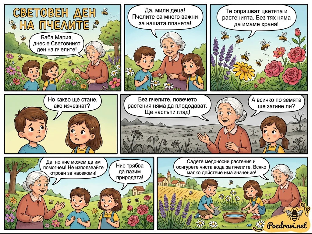Комиксът разказва за Световния ден на пчелите, като баба Мария обяснява на две деца жизненоважната роля на пчелите за опрашването на растенията и производството на храна. Той предупреждава за сериозните последици, като глад, ако пчелите изчезнат от планетата. В последните панели се дават съвети как да помогнем на пчелите, включително да не използваме инсектициди, да садим медоносни растения и да осигуряваме вода. Посланието е, че всяко малко действие за опазване на природата и пчелите има значение.