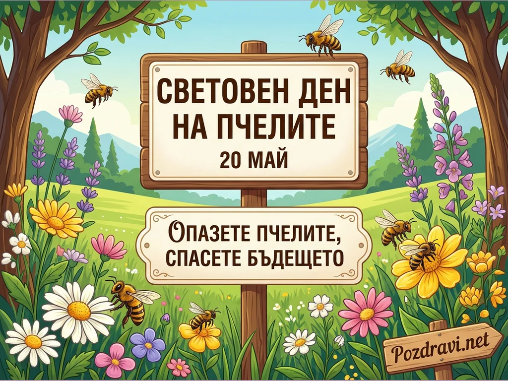 Тази ярка илюстрация в анимационен стил показва живописна поляна, изпълнена с разнообразни цветни полски цветя като маргаритки, розови, лилави и жълти цветове. Няколко пчели летят и събират нектар, подчертавайки тяхната роля в природата. В центъра е поставен дървен указател с два надписа: 'СВЕТОВЕН ДЕН НА ПЧЕЛИТЕ 20 МАЙ' и 'ОПАЗЕТЕ ПЧЕЛИТЕ, СПАСЕТЕ БЪДЕЩЕТО'. Сцената е оградена от зелени дървета, а на заден план се виждат планини под ясно синьо небе, създавайки послание за опазване на околната среда.