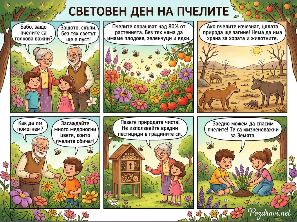 Този цветен комикс, озаглавен 'Световен ден на пчелите', образова за жизненоважната роля на пчелите за екосистемата. Той показва как пчелите опрашват растенията, осигурявайки храна, и предупреждава за опустошителните последици от тяхното изчезване. Чрез диалози между баба, дядо и деца, комиксът предлага конкретни съвети за опазване на пчелите, като засаждане на медоносни цветя и избягване на пестициди. Финалното послание призовава за общи усилия за спасяването на тези ключови опрашители, които са жизненоважни за Земята.