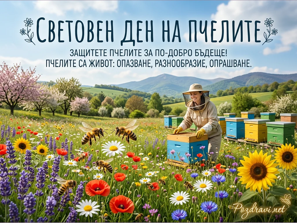 Картичката изобразява живописна пролетна сцена с пчеларка, облечена в защитен костюм, която се грижи за кошер в цветна ливада. На преден план летят пчели сред разнообразни диви цветя като макове, маргаритки, слънчогледи и лавандула. Зад пчеларката са подредени множество цветни кошери, а фонът е изпълнен с цъфтящи дървета и зелени хълмове под ясно синьо небе. В горната част на картичката е изписано 'СВЕТОВЕН ДЕН НА ПЧЕЛИТЕ' с призиви за опазване на пчелите.