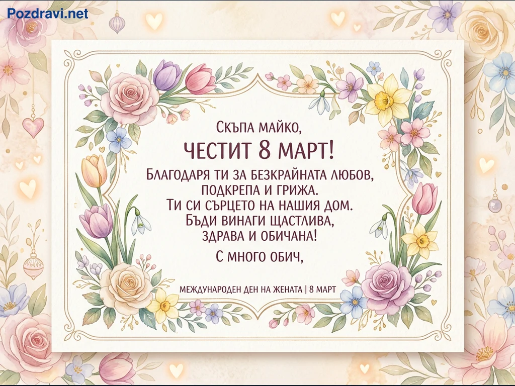 Тази дигитална картичка за 8 март е оформена с елегантна рамка, украсена с нежни акварелни цветя. В нея са изобразени рози, лалета, нарциси и кокичета в пастелни нюанси на розово, лилаво, жълто и синьо. Централното послание е 'Скъпа майко, ЧЕСТИТ 8 МАРТ!', последвано от благодарност за любовта и грижата, и пожелания за щастие, здраве и обич. Фонът е светъл, с деликатни флорални мотиви и светещи сърца, допълващи празничната атмосфера. Картичката е идеална за изразяване на обич към майка по случай Международния ден на жената.