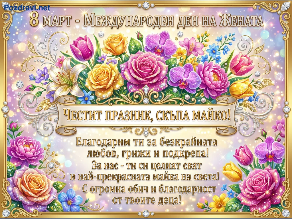 Тази празнична картичка е посветена на 8 март – Международния ден на жената, с акцент върху майките. Тя е богато украсена с пищен букет от блестящи цветя, включващи рози, лилии, орхидеи и лалета в ярки нюанси на розово, жълто, лилаво и синьо. Златна рамка с диаманти обгражда композицията, а фонът е с мек, искрящ боке ефект. В центъра е разположен свитък с надпис 'ЧЕСТИТ ПРАЗНИК, СКЪПА МАЙКО!', придружен от трогателно послание за благодарност и обич от децата.