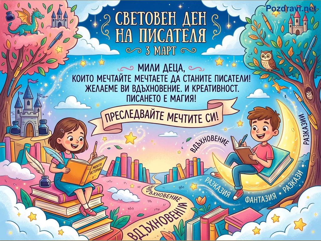 Тази цветна илюстрация отбелязва Световния ден на писателя, 3 март, с послание за вдъхновение и творчество. Тя показва две усмихнати деца, потопени в света на писането – момиче, седнало на купчина книги с перо, и момче, пишещо върху полумесец. Около тях се вият пътеки от книги, магически дървета с замъци и дракон, а небето е осеяно със звезди, символизиращи въображението и разказите. Текстът приканва децата да преследват мечтите си да станат писатели, подчертавайки, че 'Писането е магия!'.