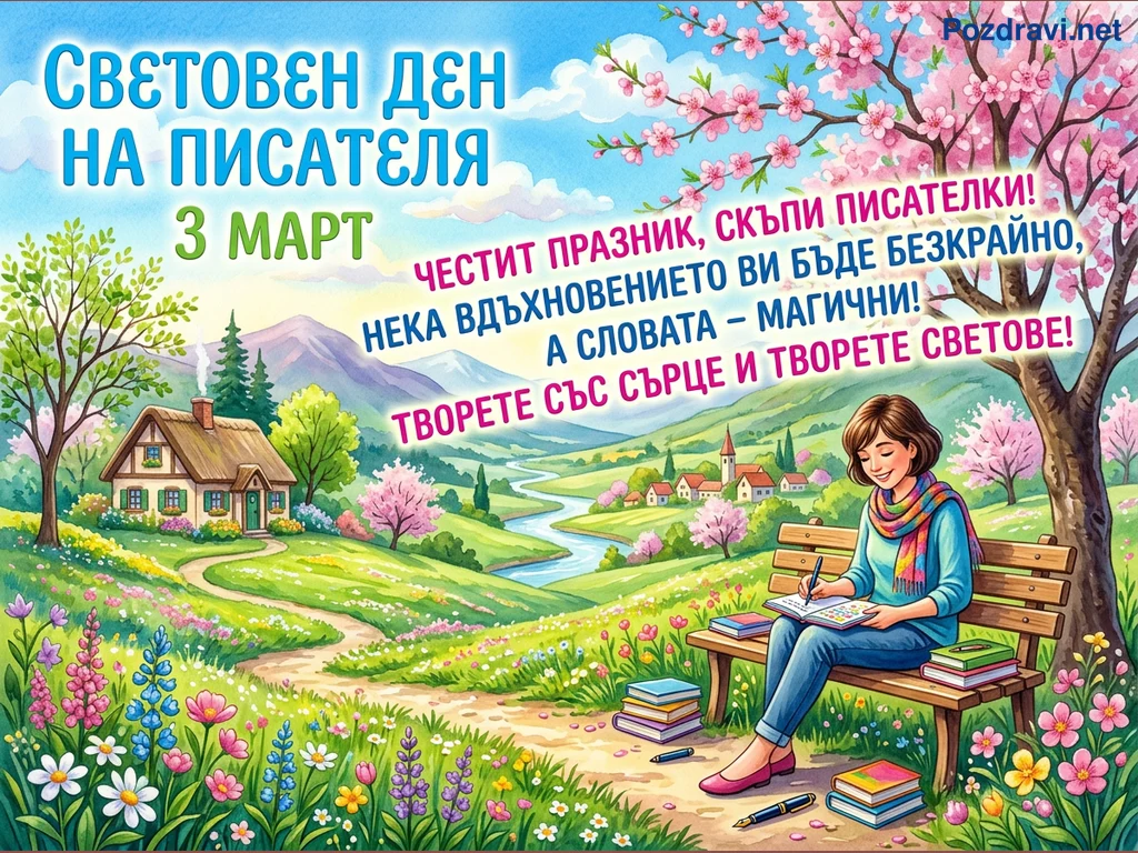 Ключови фрази: Световен ден на писателя, 3 март поздравление, Поздравителна картичка писатели, Пролетен пейзаж писателка, Вдъхновение за писатели