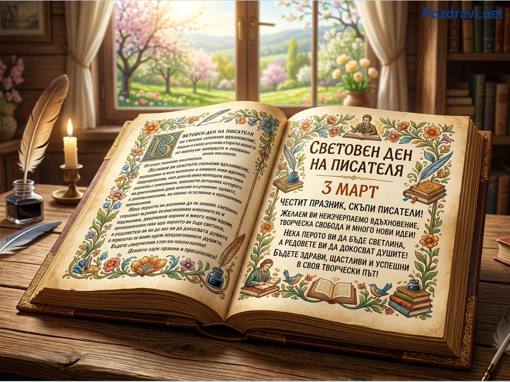 На дървена маса е разтворена старинна книга с богато илюстрирани страници. Декорациите включват флорални мотиви, пера и малки сцени с четящи хора, а дясната страница отбелязва 'СВЕТОВЕН ДЕН НА ПИСАТЕЛЯ 3 МАРТ' с празнично послание. На заден план се вижда прозорец към пролетен пейзаж с цъфтящи дървета и рафт с книги. До книгата има запалена свещ, мастилница с перо и допълнителни пера, създаващи уютна и вдъхновяваща атмосфера за писане.