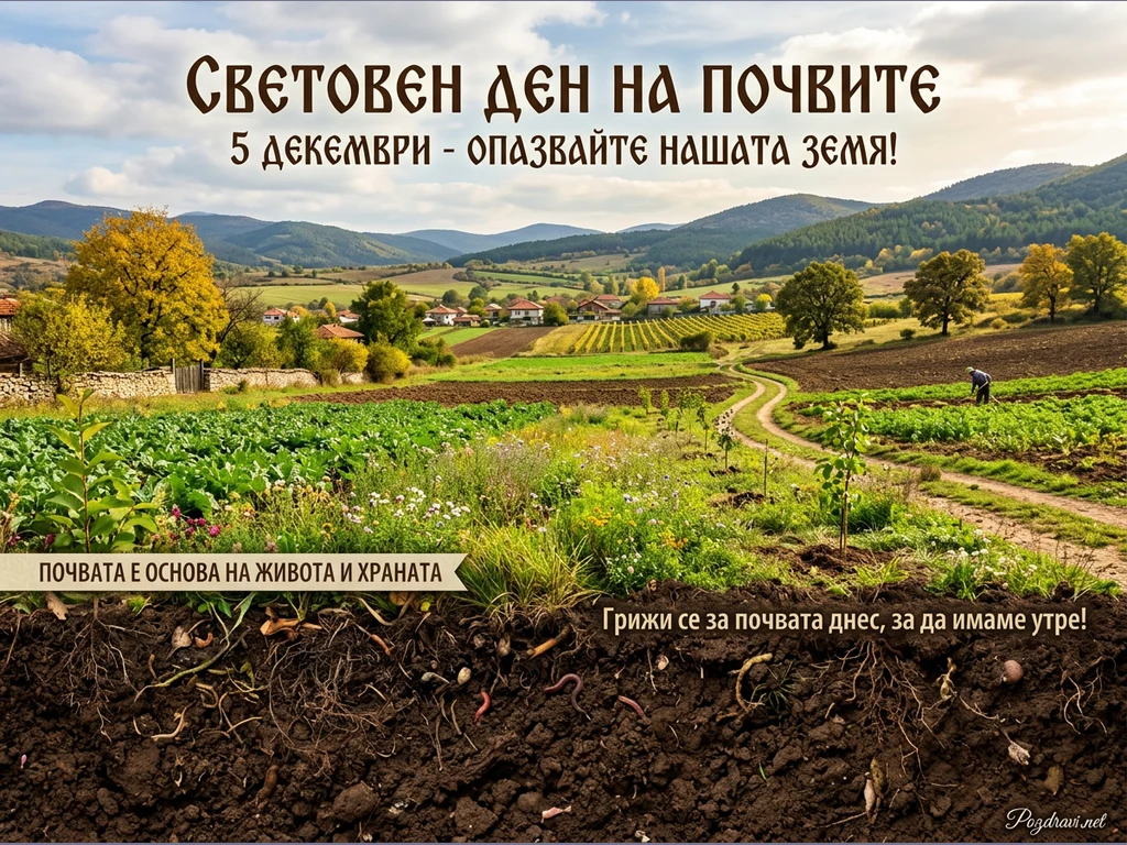 На картичката е показан живописен селски пейзаж с хълмове, малко село с къщи с червени покриви и обработваеми земи. В преден план се виждат зелени насаждения, полски път и фермер, който работи на нива. Долната част на изображението представя разрез на почвата, разкриващ корени, червеи и органична материя, подчертавайки нейното значение. Текстът отгоре обявява Световния ден на почвите на 5 декември, призовавайки за опазване на земята като основа на живота и храната.