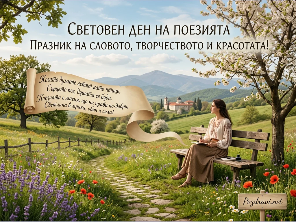Тази идилична пролетна сцена изобразява жена, седнала на дървена пейка под разцъфнало дърво, която пише в тетрадка. Каменна пътека се вие през живописна поляна, осеяна с лавандула, макове и маргаритки. На заден план се виждат хълмове, планини и отдалечена сграда, наподобяваща манастир, под ясно синьо небе. В горната част на картината е разположен свитък с надпис 'Световен ден на поезията. Празник на словото, творчеството и красотата!', придружен от вдъхновяващо стихотворение. Цялостната атмосфера е спокойна и възвисяваща, празнуваща красотата на природата и силата на поезията.