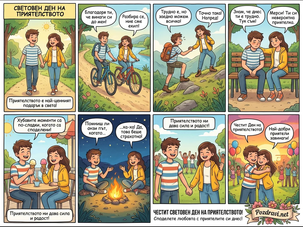 Комиксът от осем панела илюстрира Световния ден на приятелството чрез различни моменти между момче и момиче. Те са показани как споделят радостни преживявания като разходки, колоездене, хапване на сладолед и къмпинг, както и как си оказват подкрепа в трудни моменти. Всеки панел съдържа диалог или послание, подчертаващо силата, радостта и ценността на приятелството. Финалният панел показва прегръдка между двамата, заобиколени от други щастливи приятели, символизиращи споделената любов и празника. Цялостната визия е ярка и позитивна, предавайки послание за вечни приятелски връзки.