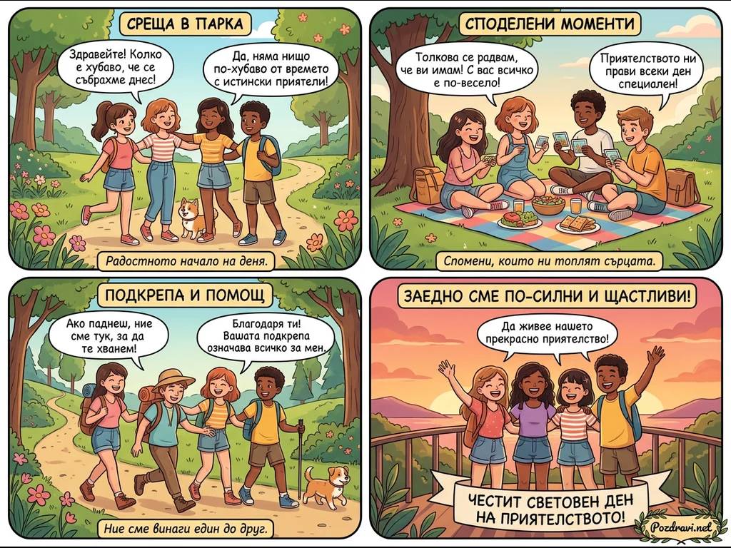 Комиксът от четири панела проследява група от четирима млади приятели и тяхното куче през различни моменти от деня. Те се срещат в парка, наслаждават се на пикник и играят карти, след което отиват на поход, показвайки взаимна подкрепа. Всички сцени подчертават радостта и силата на тяхното приятелство, както и важността да си винаги един до друг. Финалният панел ги показва на залез, празнуващи Световния ден на приятелството с послание за вечно приятелство.