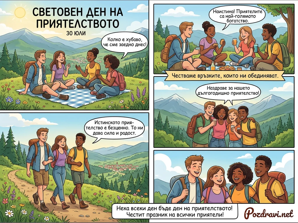 Ключови фрази: Световен ден на приятелството, Приятели в планината, Пикник с приятели, Поздрави за приятелство, 30 юли празник