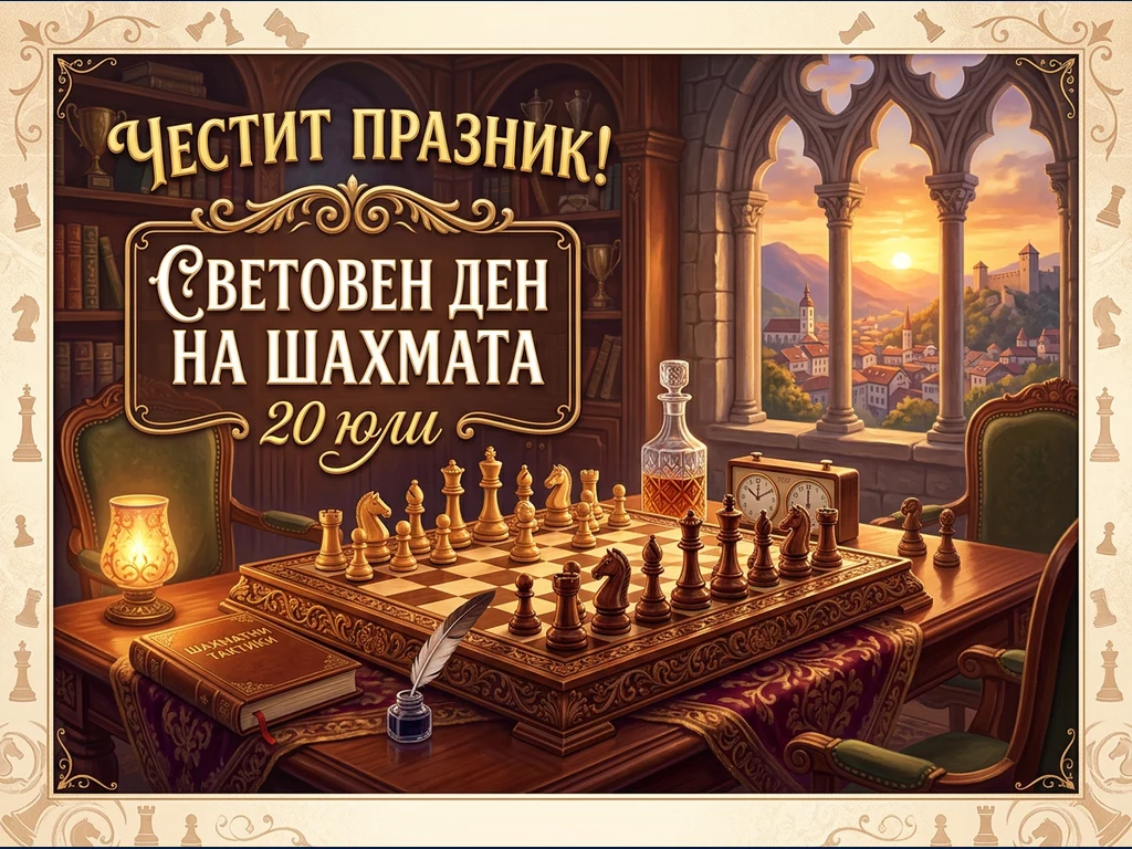 Картината изобразява елегантна стая с богато обзавеждане, където централно място заема дървена маса с шахматна дъска и фигури. На масата са поставени също книга 'Шахматни тактики', мастилница с перо, лампа, гарафа с напитка и шахматен часовник. През готически прозорец се разкрива живописна гледка към градски пейзаж със залязващо слънце над планини и крепост. Надписът 'ЧЕСТИТ ПРАЗНИК! СВЕТОВЕН ДЕН НА ШАХМАТА 20 юли' е изписан в горната част, а рамката е украсена с шахматни фигури. Цялостната атмосфера е изискана и напомня за интелектуално занимание.