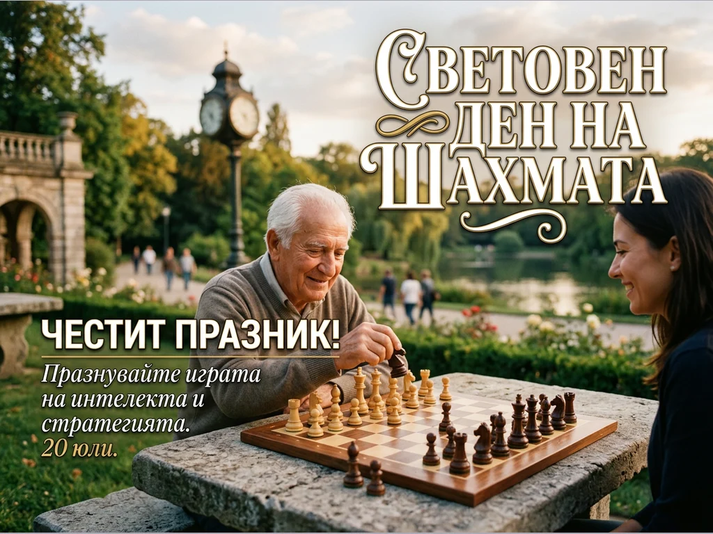 В центъра на кадъра възрастен мъж и млада жена играят шах на каменна маса в живописен парк. Мъжът, с усмивка, е на път да направи ход, докато жената го гледа с видимо удоволствие. На заден план се открояват езеро, разхождащи се хора и старинна часовникова кула, създавайки спокойна атмосфера. Надписът 'Световен ден на шаха' и поздравът 'ЧЕСТИТ ПРАЗНИК!' отбелязват 20 юли като ден за празнуване на играта на интелекта и стратегията.