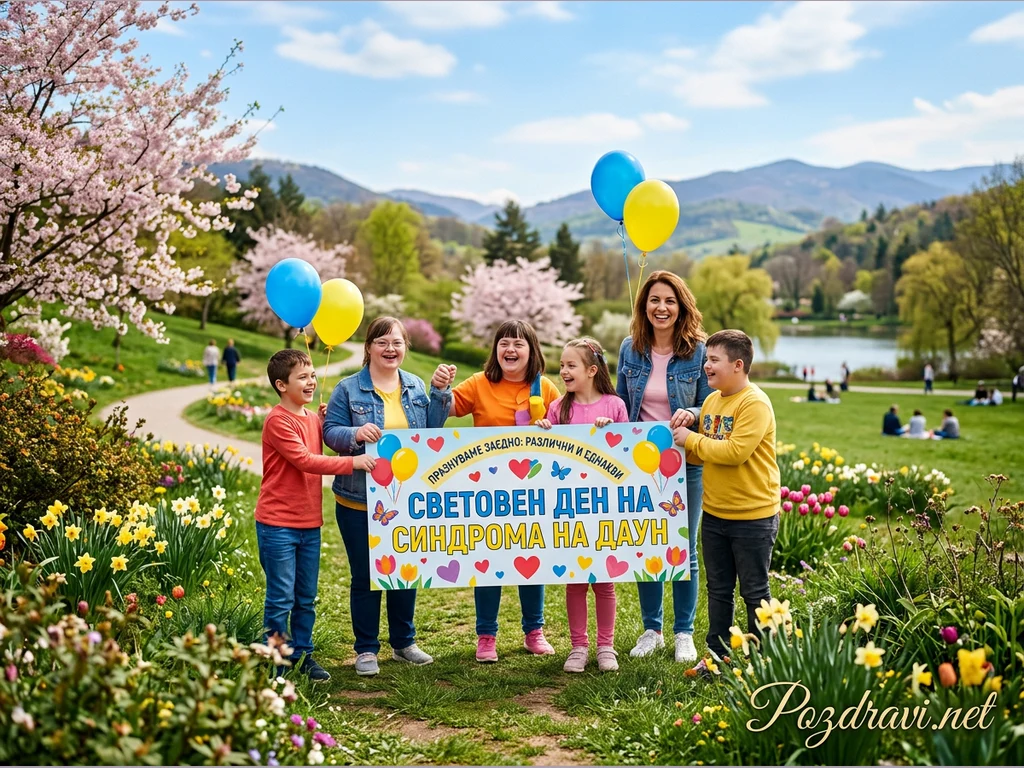 Шест усмихнати души – възрастна жена и пет деца, някои от които със синдром на Даун – позират радостно в разцъфнал пролетен парк. Те държат голям транспарант с надпис 'СВЕТОВЕН ДЕН НА СИНДРОМА НА ДАУН' и посланието 'ПРАЗНУВАМЕ ЗАЕДНО: РАЗЛИЧНИ И ЕДНАКВИ', украсен с цветя и пеперуди. Около тях цъфтят розови череши и жълти нарциси, а на заден план се простира живописен пейзаж с езеро и планини под ясно синьо небе. Групата държи и сини и жълти балони, създавайки празнична и позитивна атмосфера, която подчертава приемането и равенството.