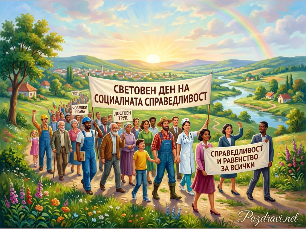 На картината е изобразена пъстра група от хора на различна възраст и професии, които вървят заедно по живописна пътека. Те носят транспаранти, прокламиращи 'Световен ден на социалната справедливост', 'Справедливост и равенство за всички', 'Човешки права' и 'Достоен труд'. Сцената е на фона на идиличен пейзаж с изгряващо слънце, река, зелени хълмове и дъга в небето, символизиращи надежда и хармония. Групата излъчва единство и решимост в стремежа си към по-добро бъдеще за всички.