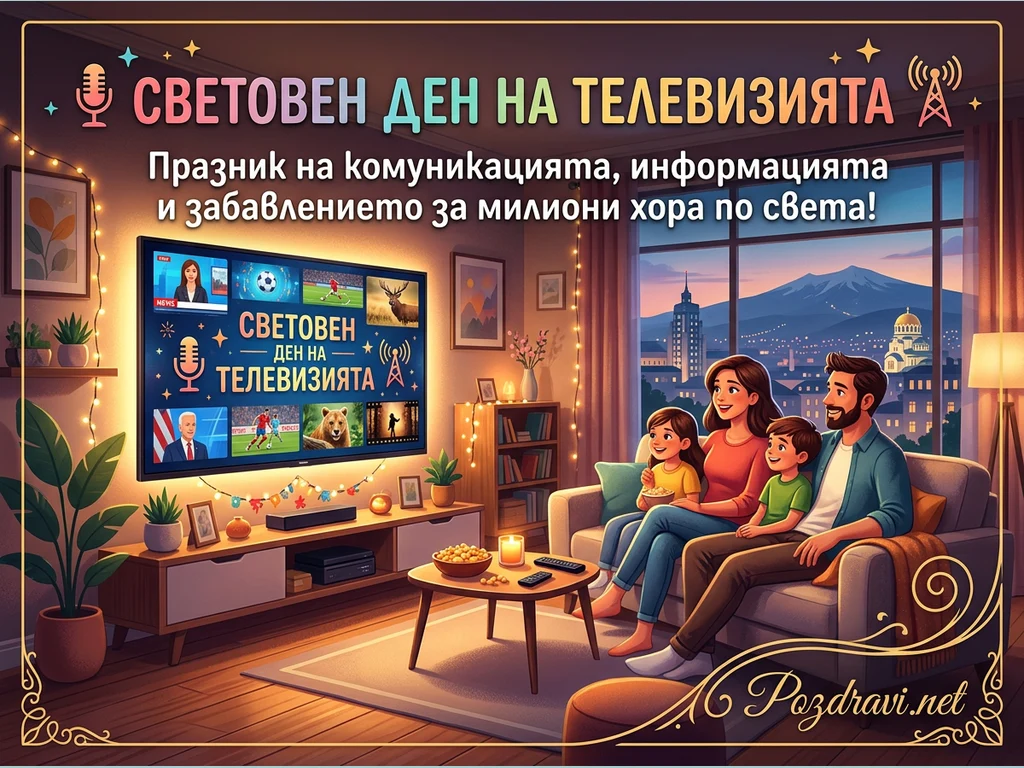 Ключови фрази: Световен ден на телевизията, Семейство гледа телевизия, Празник на комуникацията, Поздравителна картичка, Уютен дом
