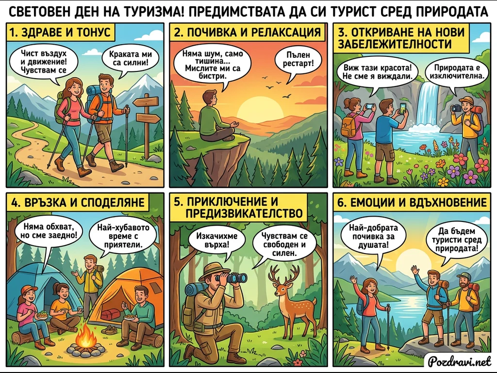 Цветен комикс представя шест основни предимства на туризма сред природата, отбелязвайки Световния ден на туризма. Панелите илюстрират ползи като здраве и тонус чрез планински преходи, почивка и релаксация чрез медитация сред природата, както и откриване на нови забележителности като водопади. Показани са също връзката и споделянето по време на къмпинг с приятели, приключенията и предизвикателствата при наблюдение на дивата природа. Всички сцени подчертават емоциите и вдъхновението, които природата дарява, представяйки щастливи хора, наслаждаващи се на различни дейности на открито.