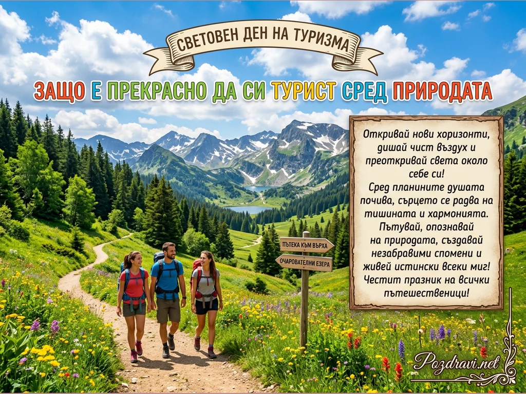 Трима усмихнати туристи с раници вървят по живописна планинска пътека, обградена от буйна зелена растителност и пъстри полски цветя. На заден план се издигат величествени заснежени върхове и гъсти иглолистни гори, а в далечината се вижда спокойно планинско езеро под ясно синьо небе. Дървен указател насочва към 'ПЪТЕКА КЪМ ВЪРХА' и 'ОЧАРОВАТЕЛНИ ЕЗЕРА', подчертавайки възможностите за приключения. В горната част на картичката е изписано 'СВЕТОВЕН ДЕН НА ТУРИЗМА' и 'ЗАЩО Е ПРЕКРАСНО ДА СИ ТУРИСТ СРЕД ПРИРОДАТА', а вдясно има послание за красотата на пътешествията в природата.