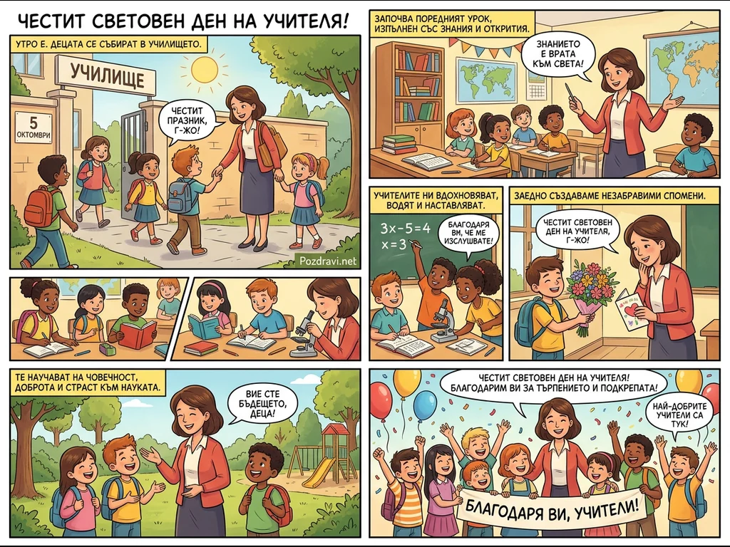 Този комикс от няколко панела илюстрира Световния ден на учителя, 5 октомври. Той показва ученици, които пристигат в училище, учат в класната стая с ентусиазъм и подаряват цветя на своята учителка. Учителката е изобразена като вдъхновяваща фигура, която наставлява децата в различни учебни дейности, включително четене, математика и наука. Комиксът завършва с радостна сцена, където децата изразяват своята благодарност към учителите си, подчертавайки тяхната важна роля в оформянето на бъдещето.