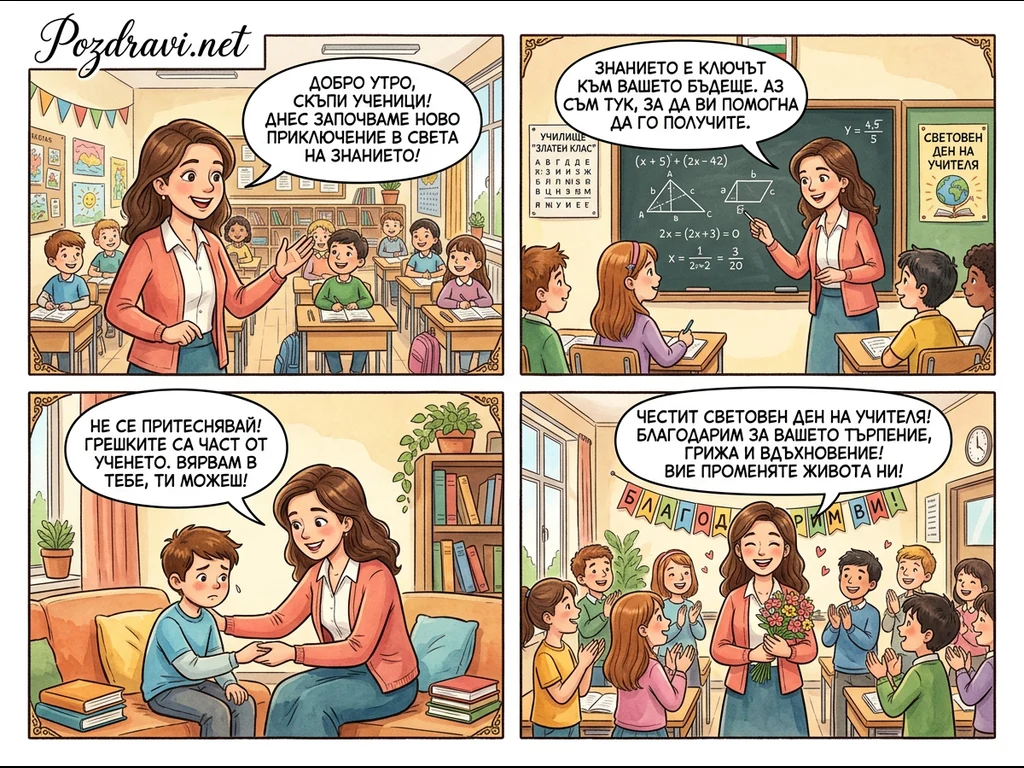 Комиксът в четири панела проследява ежедневието на една учителка и нейните ученици, подчертавайки ролята ѝ в тяхното развитие. В първите две сцени тя преподава в класната стая, приветствайки децата за ново приключение в света на знанието и обяснявайки, че то е ключ към бъдещето им. Третият панел я показва как утешава разстроен ученик, уверявайки го, че грешките са част от ученето и вярвайки в неговите способности. В последната сцена учениците ѝ благодарят с цветя и аплодисменти по случай Световния ден на учителя, изразявайки признателност за нейното търпение, грижа и вдъхновение.