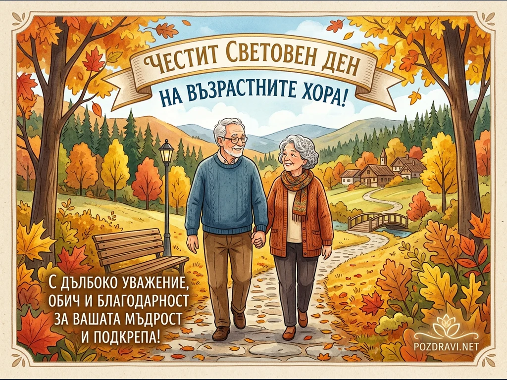 На картичката е изобразена усмихната възрастна двойка, вървяща ръка за ръка по калдъръмена пътека през живописен есенен пейзаж. Около тях има дървета с ярко оранжеви и жълти листа, а на заден план се виждат хълмове, малко селце с къщи и мост над река. В горната част е изписано 'ЧЕСТИТ СВЕТОВЕН ДЕН НА ВЪЗРАСТНИТЕ ХОРА!', а в долния ляв ъгъл – послание за уважение и благодарност. Цялостната атмосфера е топла и празнична, подчертаваща красотата на есента и мъдростта на възрастта.