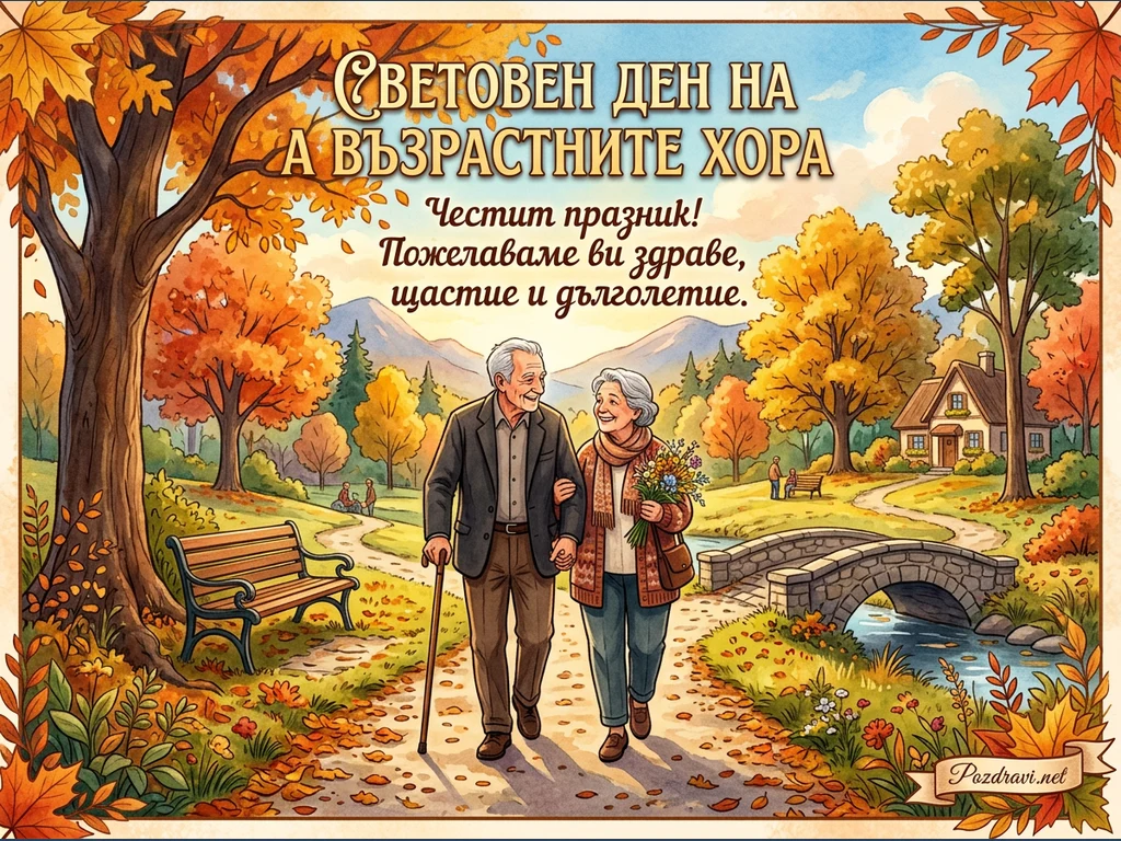 Ключови фрази: Световен ден на възрастните хора, Поздравителна картичка есен, Възрастни хора празник, Есенен пейзаж двойка, Пожелания дълголетие