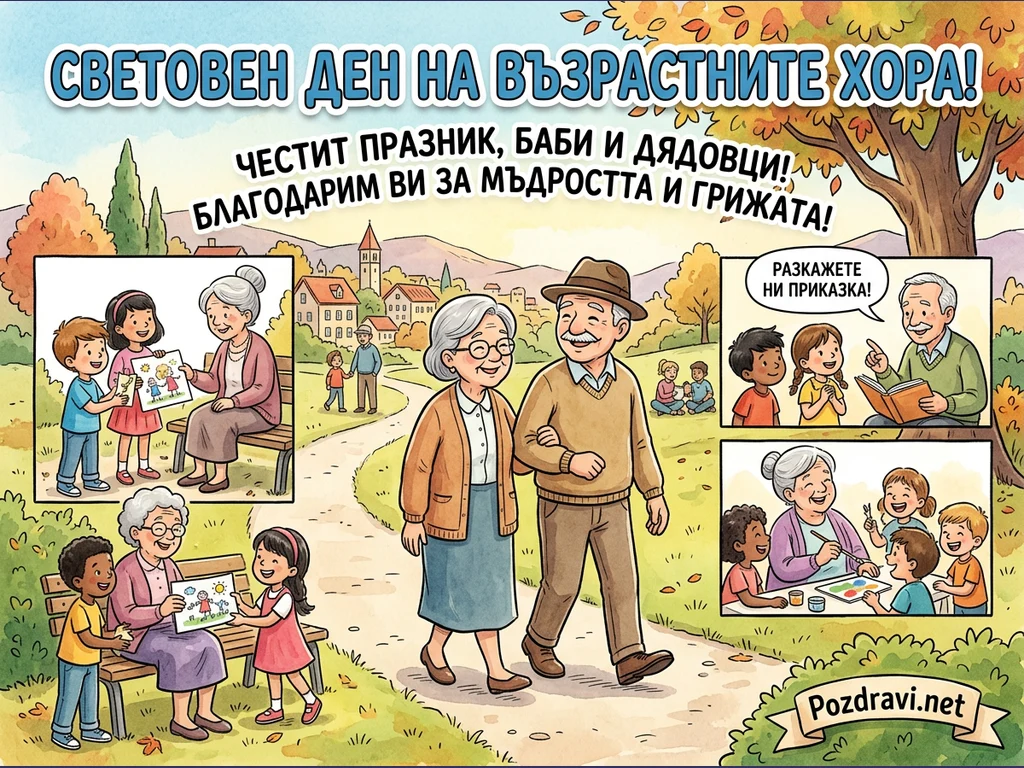 Тази илюстрация отбелязва Световния ден на възрастните хора с топли и сърдечни сцени. В центъра възрастна двойка се разхожда ръка за ръка в есенен парк, а на заден план се вижда живописно селище. Около тях са изобразени деца, които подаряват рисунки на баби, дядо, който чете приказки, и баба, която рисува с внуци. Цялостната композиция излъчва благодарност и уважение към мъдростта и грижата на по-възрастните поколения. Надписът 'Честит празник, баби и дядовци! Благодарим ви за мъдростта и грижата!' подчертава посланието на празника.