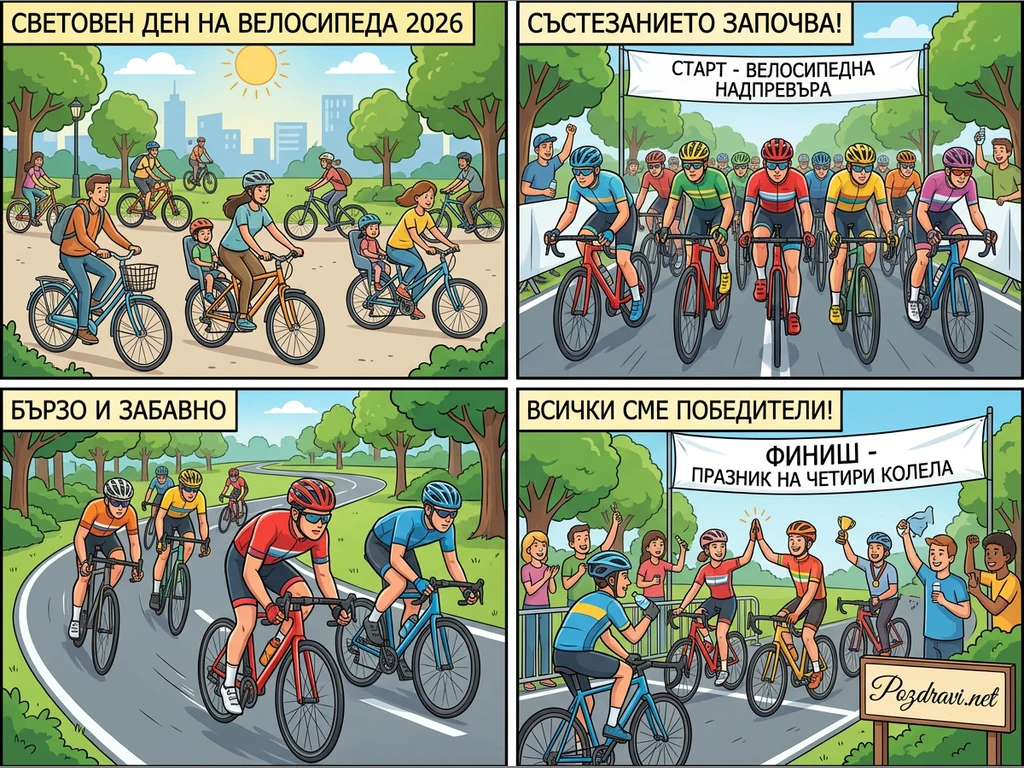 Комиксът от четири панела проследява събитие, посветено на колоезденето. В горния ляв панел семейства и индивидуални колоездачи се наслаждават на спокойна разходка по случай Световния ден на велосипеда 2026. Горният десен и долният ляв панел показват старта и хода на състезателна надпревара, с колоездачи в пълна екипировка, демонстриращи скорост и умения. Долният десен панел изобразява финала, където участниците празнуват, някои си дават пет, а един държи трофей, подчертавайки духа на победата и общото забавление. Цялата поредица предава послание за радостта от колоезденето, както като спорт, така и като свободно време.