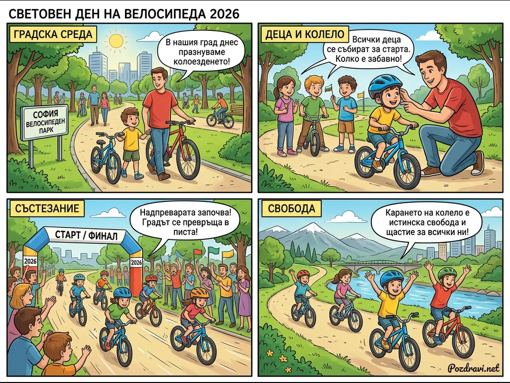 Този комикс от четири панела отбелязва Световния ден на велосипеда 2026, показвайки различни аспекти на колоезденето. Започва с баща и син в градски парк, където се празнува колоезденето, и преминава към подготовка за детско състезание. Децата участват в оживена надпревара, а публиката ги аплодира под арка 'Старт/Финал'. Завършва с щастливи деца, каращи колела сред живописна природа, подчертавайки свободата и радостта, които носи колоезденето.