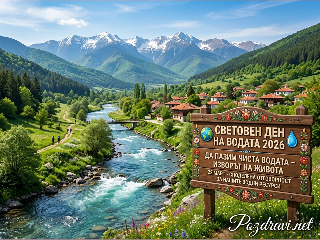 Живописен планински пейзаж разкрива буйна зелена долина, през която тече кристалночиста река. В далечината се издигат величествени заснежени върхове под ясно синьо небе, а по бреговете на реката е сгушено традиционно българско село с червени покриви. На преден план е поставен дървен знак, който отбелязва Световния ден на водата 2026 с послание за опазване на чистата вода като извор на живота и споделена отговорност за водните ресурси на 22 март. Покрай реката се виждат хора, разхождащи се по пътека, сред цъфтящи пролетни цветя.