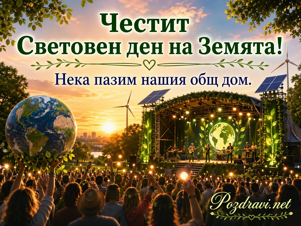 Празнична сцена на Световния ден на Земята се разгръща на открито по време на топъл залез с мека златиста светлина. В центъра се вижда голяма озеленена сцена с музиканти, осветление и кръгъл символ на планетата, който подчертава екологичната тема. Пред сцената се е събрала многобройна публика, която държи светлини и създава усещане за общност и вдъхновение. В лявата част на композицията хора издигат голям глобус над тълпата, което засилва внушението за грижа към общия дом. Наоколо личат соларни панели, вятърни турбини и богата зеленина, които насочват към чиста енергия и уважение към природата. В горната част е изписано поздравление за Световния ден на Земята, а под него стои призив да пазим нашия общ дом. Общото настроение е тържествено, природосъобразно и изпълнено с надежда за по-чиста и устойчива планета.