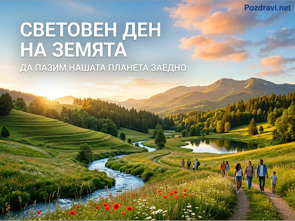 Тази живописна сцена разкрива буйна природа по време на залез или изгрев, с мека златна светлина, огряваща пейзажа. В центъра се виждат зелени хълмове, пресичани от извиваща се река и спокойно езеро, заобиколени от гъсти гори и величествени планини на заден план. Група от хора, включително семейства, се разхождат по пътека през поляна, осеяна с диви цветя като макове и маргаритки. Надписът 'СВЕТОВЕН ДЕН НА ЗЕМЯТА' и 'ДА ПАЗИМ НАШАТА ПЛАНЕТА ЗАЕДНО' подчертава посланието за опазване на природата. Цялостната атмосфера е спокойна и вдъхновяваща, приканваща към съхраняване на красотата на Земята.