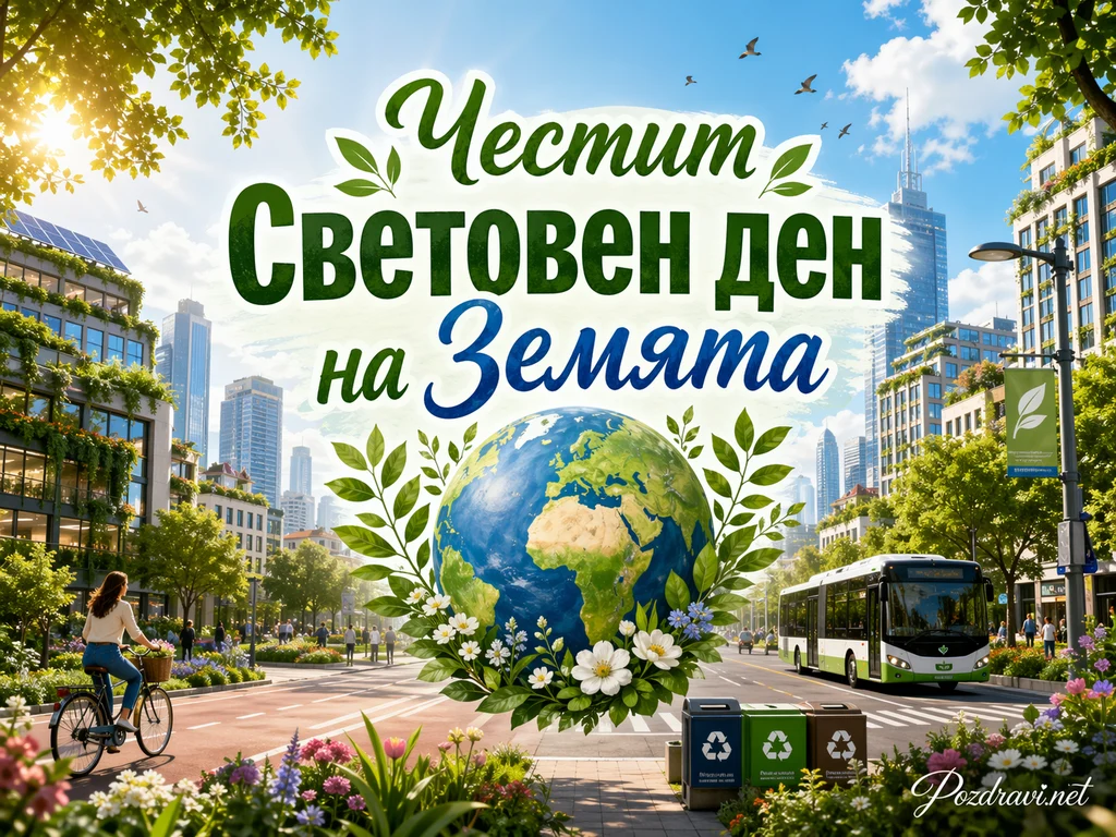 Слънчев и модерен градски булевард е изпълнен с дървета, цветя и усещане за чиста и зелена среда. В центъра се откроява голямо земно кълбо, обградено от свежи зелени листа и бели цветове, което подсилва темата за природата и опазването на планетата. Над него с големи декоративни букви е изписано послание за Честит Световен ден на Земята в зелени и сини тонове. От двете страни на улицата се виждат съвременни сгради с много растителност по фасадите и покривите, което внушава хармония между градската среда и екологията. По пътя се движи електрически автобус, а вляво жена кара велосипед, което допълва идеята за устойчив и природосъобразен начин на живот. На преден план има кошчета за разделно събиране на отпадъци, а в небето летят птици сред ярка синя атмосфера и меки бели облаци. Цялата сцена носи чувство за надежда, чистота и грижа към Земята.